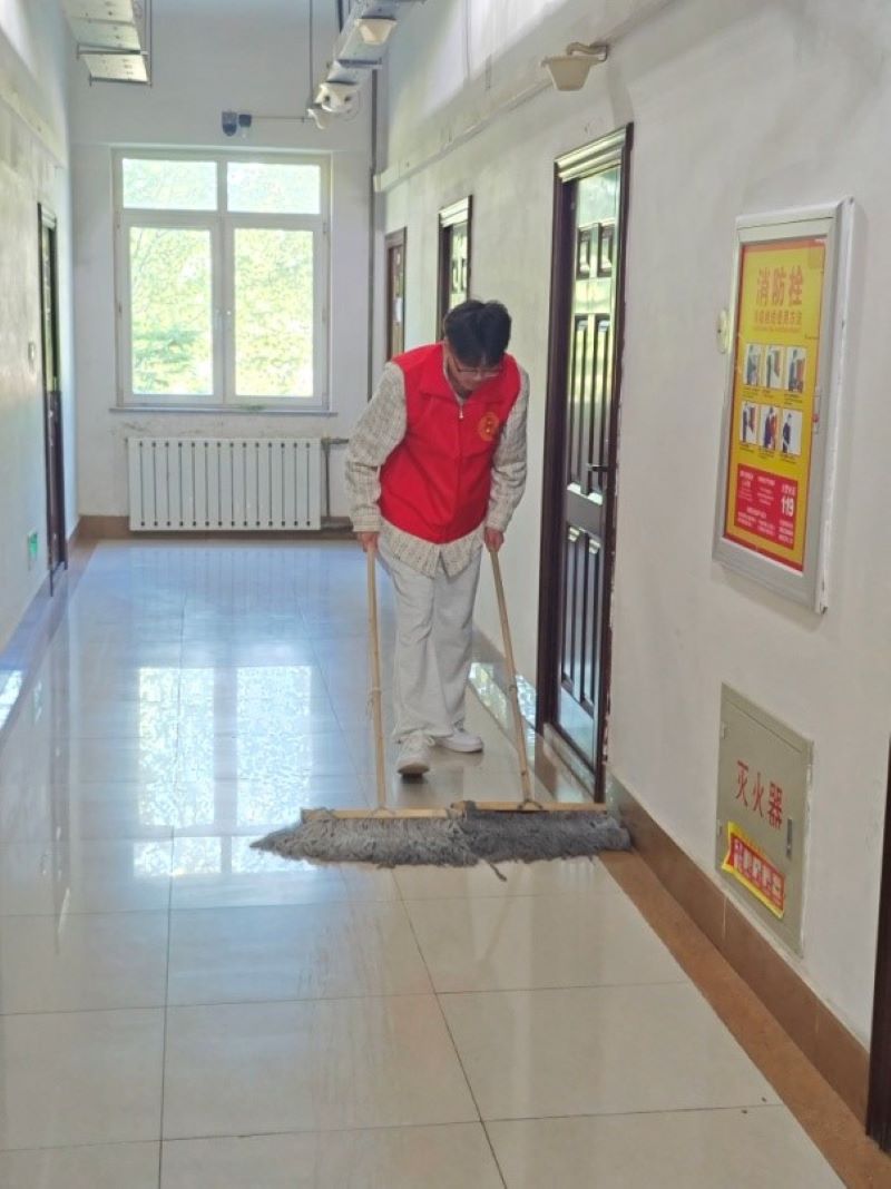 清晨,阳光透过窗户洒进楼道,将地面照得闪闪发光。志愿者们陆续来到楼道,准备与住宿管阿姨一同开展卫生打扫活动。阿姨们脸上洋溢着笑容,仿佛看到了自己的孩子们一样。