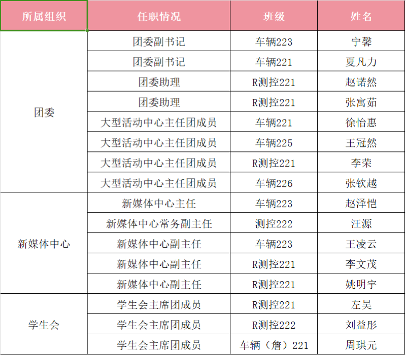 机车车辆工程学院2024-2025学年团委、学生会、新媒体中心主要学生干部的通知》(大交大机车团发[2024]3号)文件相关要求,前期经过个人报名、资格审查、组织考察、理论素质测试、竞聘面试考核等环节,结合岗位需要,公开选拔了团学组织主要学生干部,现将具体人选公示如下: