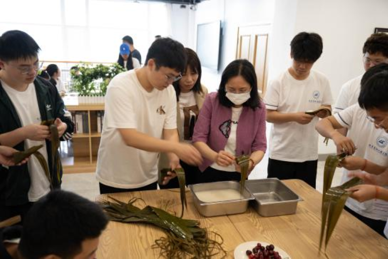随后,同学们拿着五彩丝线缠绕、打结、编织,一气呵成,编出了各种形状和风格的漂亮五色丝线装饰,增添节日的氛围和粽子的美感。在这个过程中,大家不仅学会了如何包粽子栓丝线,也尝到了饱含师生回忆的悠悠粽香,感受到了浓浓的师生情谊。