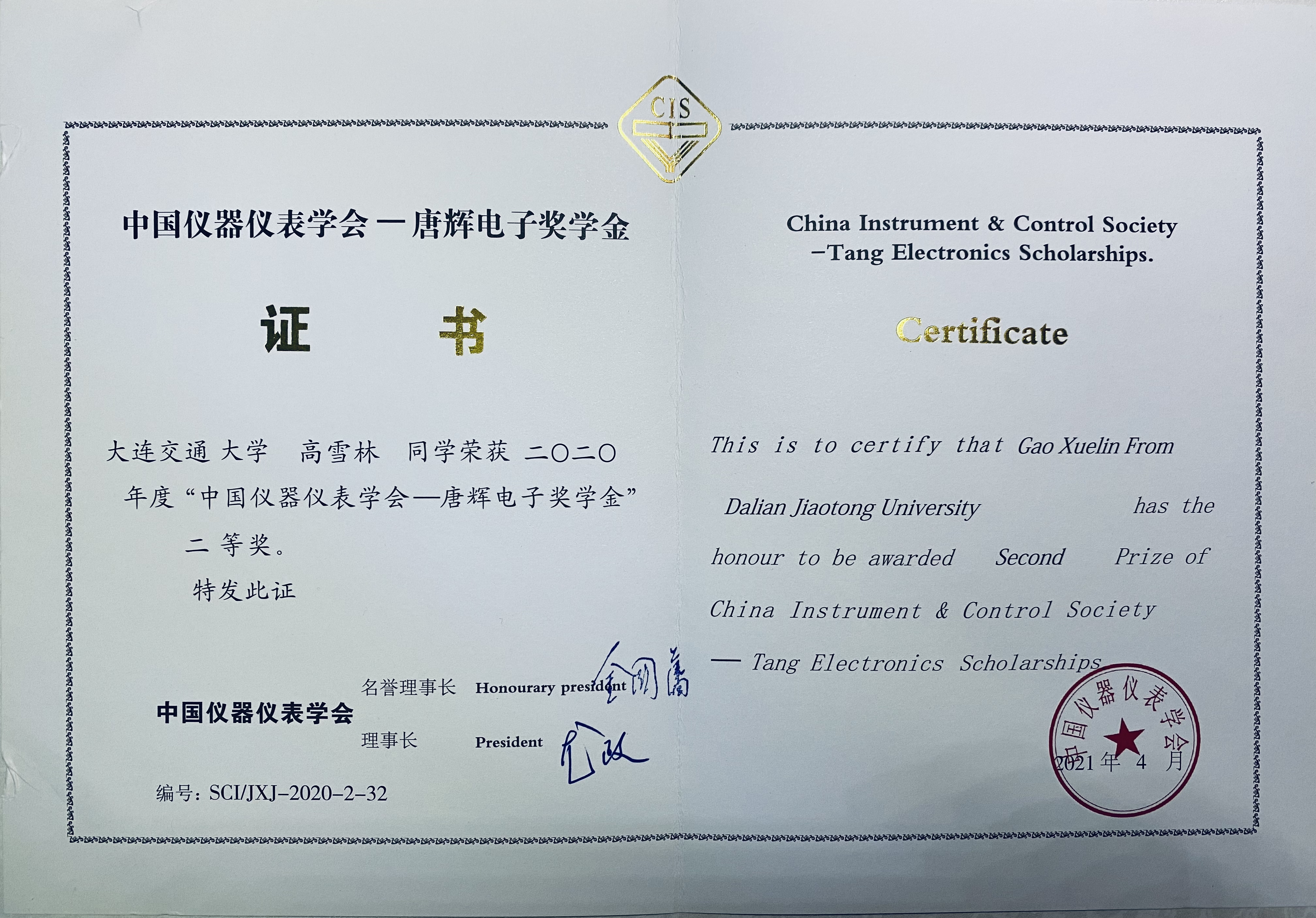 日前,2020年度“中国仪器仪表学会---唐辉电子奖学金”获奖名单正式公布,机车车辆工程学院测控技术与仪器+软件工程专业182班高雪林同学荣获二等奖学金。