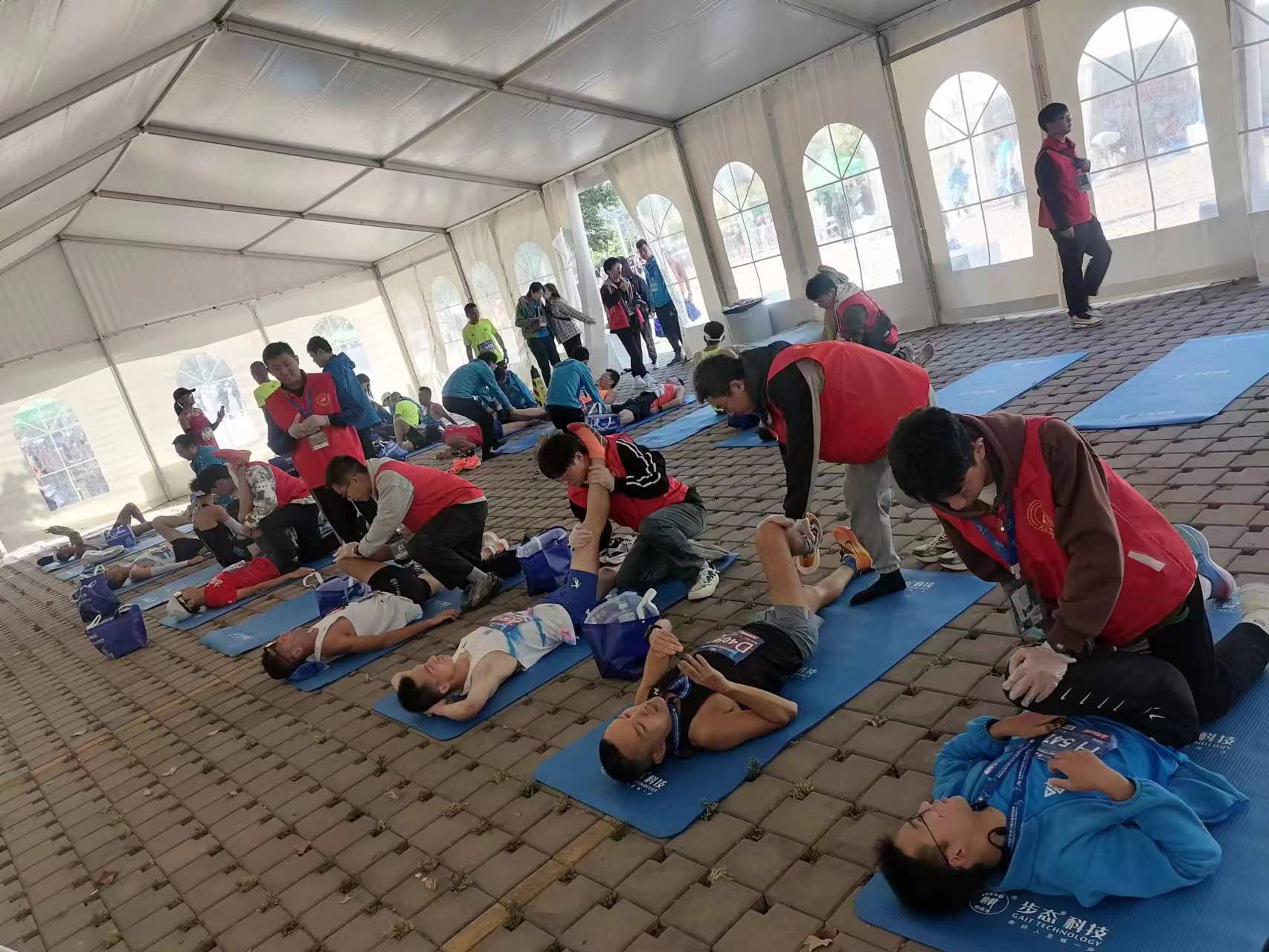 志愿者在研究生辅导员荆磊的带队下,天不亮便从学校出发,早早到达现场集合完毕。大家分工明确、井然有序,做好各项准备工作。志愿者们运用肌肉静态牵伸、按摩等放松手法为参赛选手们缓解运动后的疲劳。大部分志愿者们午饭都没顾得上吃,尽管天气很凉,但志愿者们都干得满头大汗,热火朝天,全天累计服务运动员上千人次。
