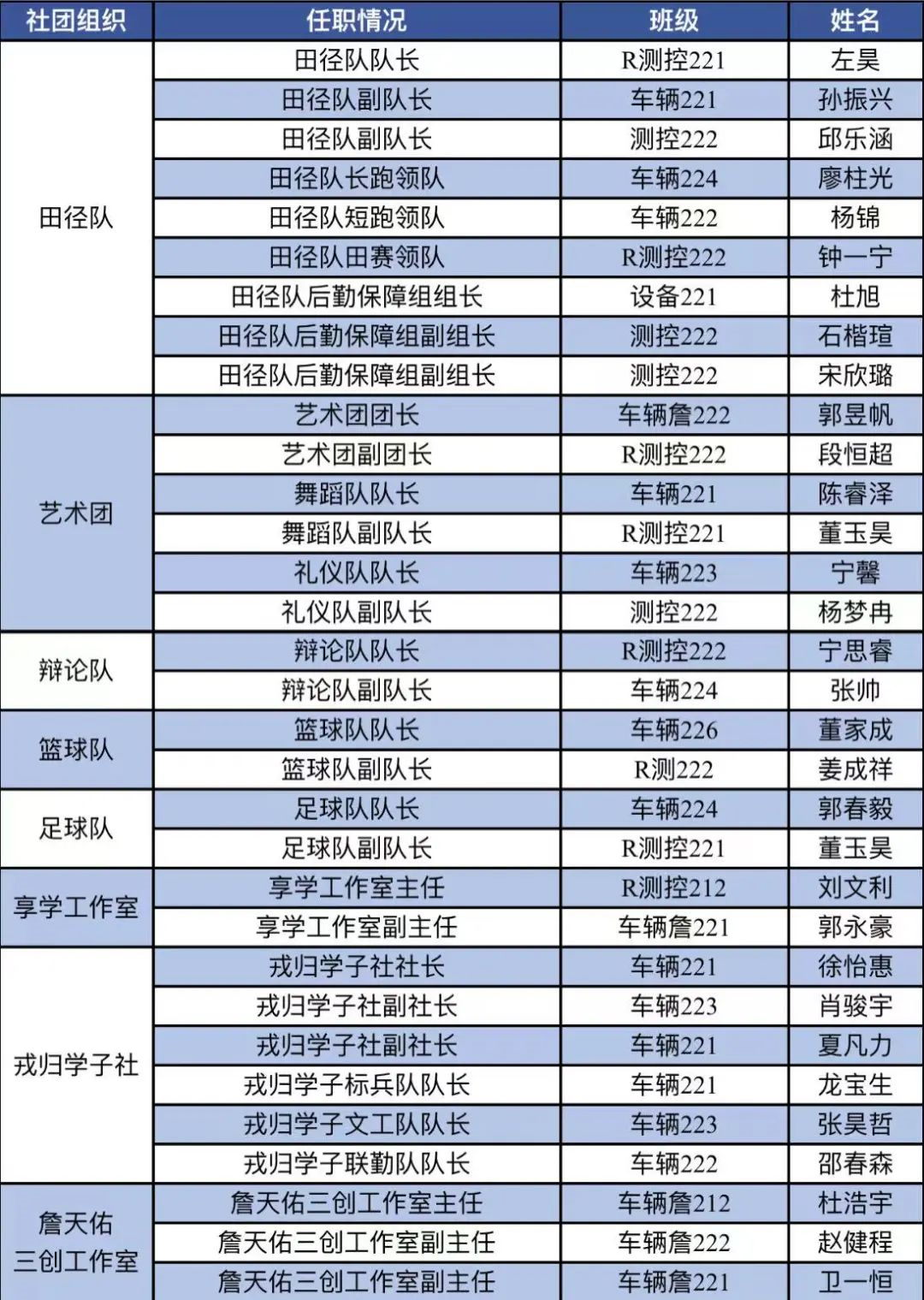 机车车辆工程学院大型活动中心、学生社团组织工作职责的通知》(大交大机车团发〔2023〕3号)要求,经过个人报名、资格审查、组织考察等环节,经院团委研究,决定任夏凡力为团委助理,任马悦童、齐金宇为大型活动中心主任,对左昊等32名社团组织负责人进行备案(考察期3个月)。现将具体名单公布如下: