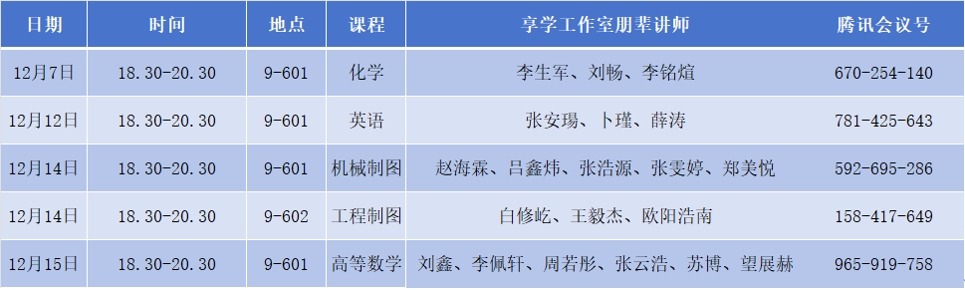 本次补习内容将重点围绕期末考试科目,系统梳理、查漏补缺。院学习部、享学工作室结合前期调研过程中各年级学生的不同需求,组织工作室的朋辈讲师们精心制作课程。第一期具体补习课程安排如下: