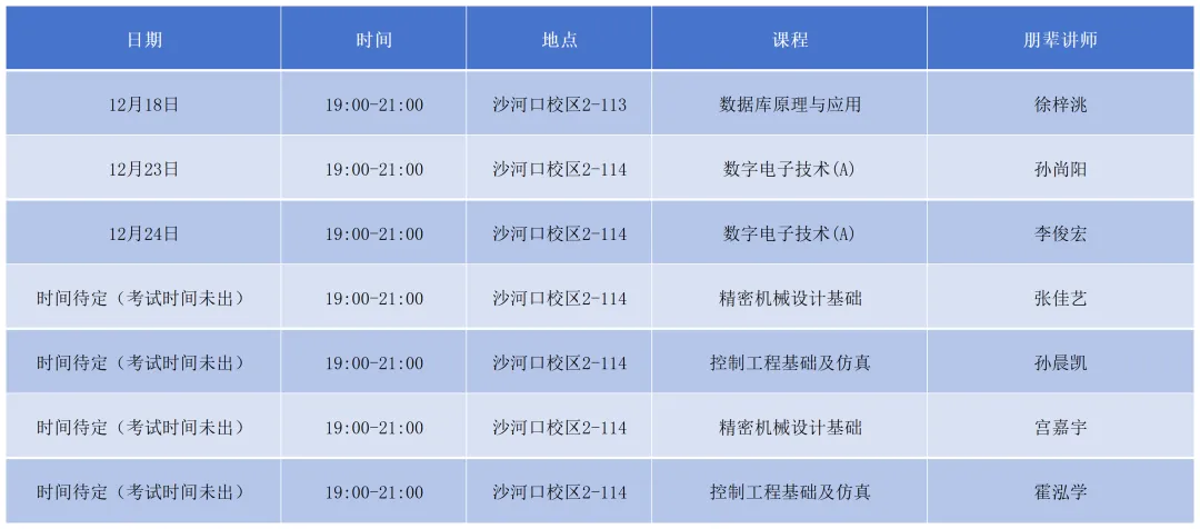 本期朋辈讲师团来自于测控技术与仪器、测控技术与仪器+软件工程专业,重点围绕该专业期末考试科目,帮助大家系统梳理、查漏补缺。第四期具体补习课程安排如下: