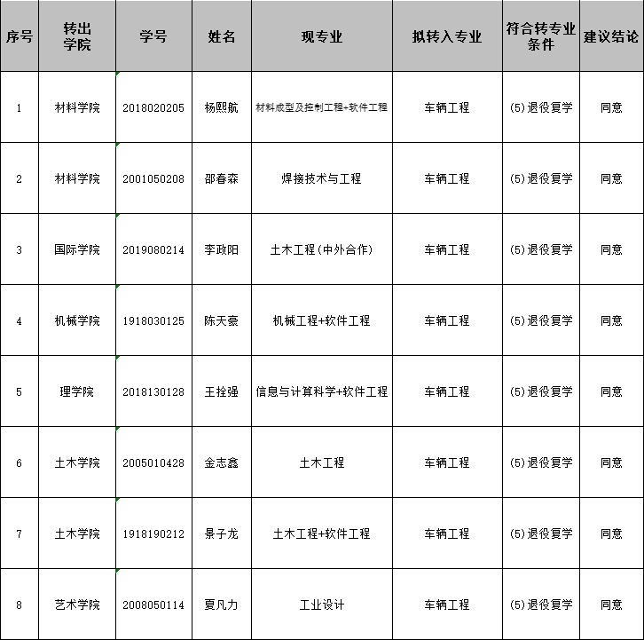 本科生转专业管理办法》规定,经学生个人申报、学校审核,学院面试及转专业领导小组投票决定,拟确定杨熙航等8人转入车辆工程专业相应年级学习。